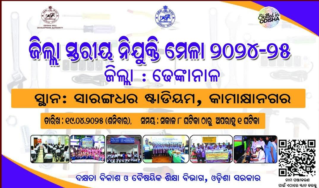 ଜିଲ୍ଲା ସ୍ତରୀୟ ନିଯୁକ୍ତି ମେଳା, ଢେଙ୍କାନାଳଓଡିଶା ଦକ୍ଷତା ବୃଦ୍ଧି ପ୍ରାଧିକରଣ ଆନୁକୁଲ୍ୟରେ ଜିଲ୍ଲା ପ୍ରଶାସନ ସହଯୋଗରେ ଆସନ୍ତା ତା- ୧୯.୦୪.୨୦୨୫ ରିଖ ଶନିବାର ଦିନ ସାରଙ୍ଗଧର ଷ୍ଟାଡିଅମ, କାମାକ୍ଷାନଗର, ଢେଙ୍କାନାଳ ଠାରେ ଜିଲ୍ଲାସ୍ତରୀୟ ନିଯୁକ୍ତି ମେଳାର ଆୟୋଜନ କରା ଯାଉଅଛି I ଏହି ନିଯୁକ୍ତି ମେଳାରେ ଜିଲ୍ଲାର ସମସ୍ତ ବ୍ଲକ ଓ ସହରାଂଚଳର ୫ମ ଶ୍ରେଣୀ ପାସ ଠାରୁ ୧୦ମ, +୨, +୩, ଆଇ.ଟି.ଆଇ(ITI), ଡିପ୍ଲୋମା(Diploma), ଏଏନଏମ(ANM), ଜିଏନଏମ(GNM ) , ବି. ଟେକ (B .Tech ) ପାସ ଓ ବୟସ ସୀମା ୧୫ ରୁ ଉର୍ଦ୍ଧ୍ବ ହୋଇଥିବା ନିଯୁକ୍ତି ଆଶାୟୀ ଯୁବକ ଓ ଯୁବତୀ ଅଂଶ ଗ୍ରହଣ କରି ପାରିବେ I ଉକ୍ତ ମେଳା ରେ ରାଜ୍ୟ ତଥା ରାଜ୍ୟ ବାହାରୁ ରୁ automotive/ green jobs/ Electronics/ Health Care, Banking /Finance/ Security/ Manufacturing/ Apparel ଇତ୍ୟାଦି ସେକ୍ଟର ରେ ସୁଯୋଗ ଥିବା ନିଯୁକ୍ତି ଦାତା ସଂସ୍ଥା, ସରକାର ଙ୍କ ସହ ଚୁକ୍ତି ବଧିତ ନିଯୁକ୍ତି ଭିତ୍ତିକ ତାଲିମ ପ୍ରଦାନକାରୀ ସଂସ୍ଥା ଓ ଶିଳ୍ପ ତାଲିମ ଶିକ୍ଷା ଅନୁଷ୍ଠାନ ଯୋଗ ଦେବାର କାର୍ଯ୍ୟକ୍ରମ ରହିଛି I ଏଣୁ ଢେଙ୍କାନାଳ ଜିଲ୍ଲା ର ସମସ୍ତ ନିଯୁକ୍ତି ଆଶାୟୀ ଯୁବକ ଓ ଯୁବତୀ ମାନଙ୍କୁ ନିଜର ଶିକ୍ଷାଗତ ଯୋଗ୍ୟତା ପ୍ରମାଣପତ୍ର ଓ ଆଧାର କାର୍ଡ ସହିତ ଉକ୍ତ ମେଳାରେ ସକାଳ ୮:୦୦ ଘଟିକା ରୁ ଦିବା ୧:୦୦ ଘଟିକା ମଧ୍ୟରେ ଯୋଗ ଦେବା ପାଇଁ ଜିଲ୍ଲା ପ୍ରଶାସନ ତରଫ ରୁ ଅନୁରୋଧ କରା ଯାଉଛି |